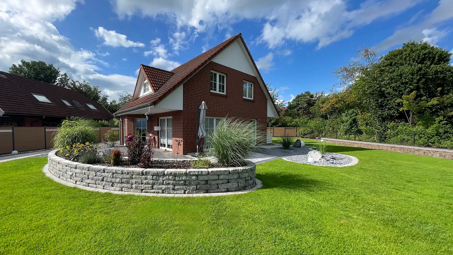 Ein dichter, grüner Rasen betont die Architektur und bietet einen lebendigen Kontrast zu Wegen und Beeten. Er trägt wesentlich dazu bei, potenzielle Käuferinnen und Käufer emotional zu binden und den Wert des Eigentums hervorzuheben.